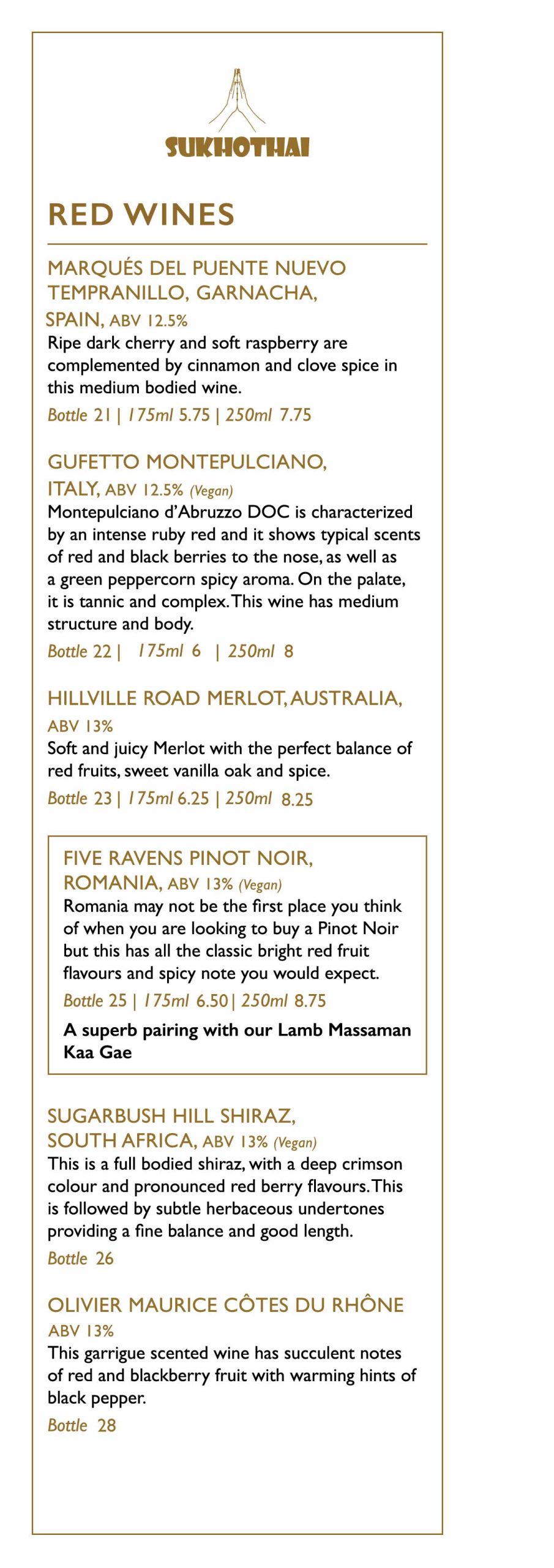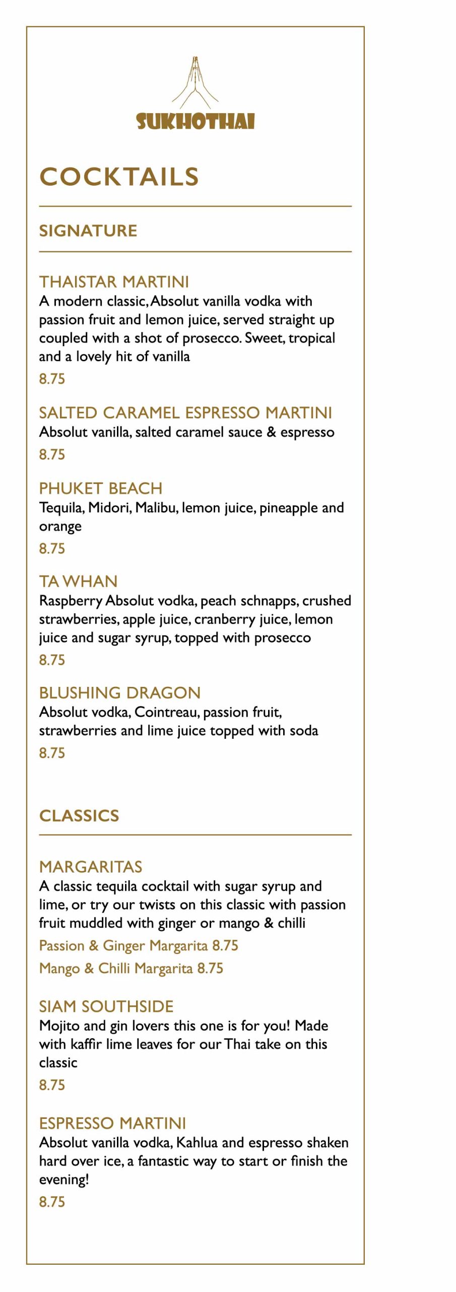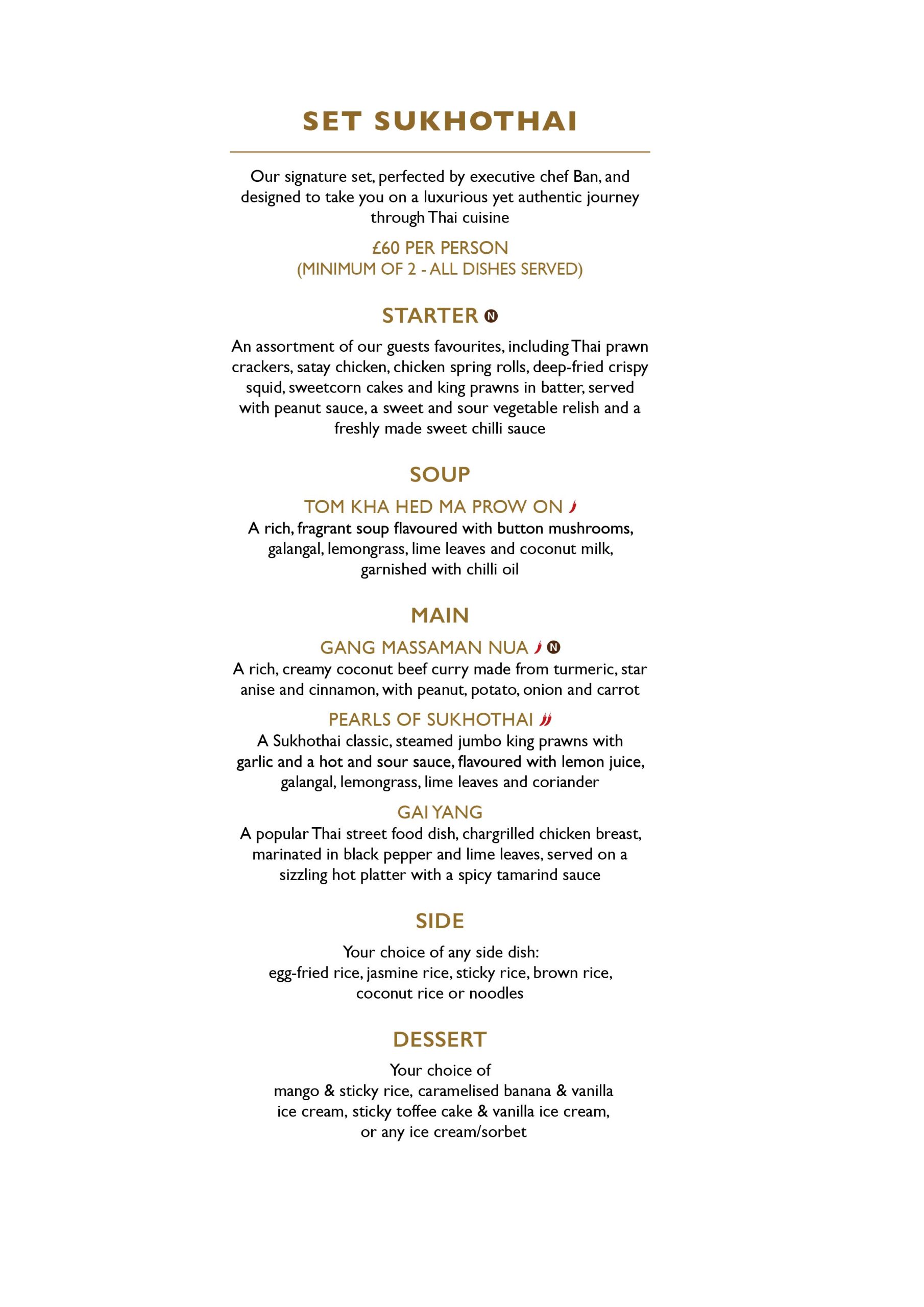 Explore many Sukhothai favourites, including authentic Thai starters, salads, soups, main courses, sides & desserts, vegetarian & halal options will be available.